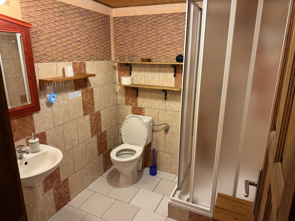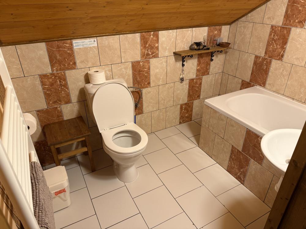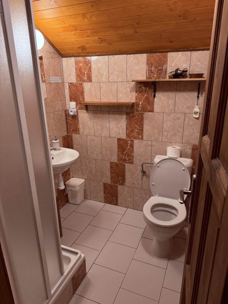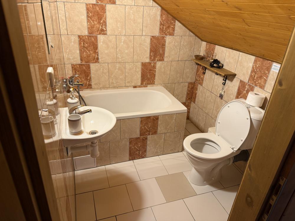 - Na pokoji je k dispozici pouze umyvadlo. Vlastní koupelna s toaletou a sprchou se nachází o patro níže.